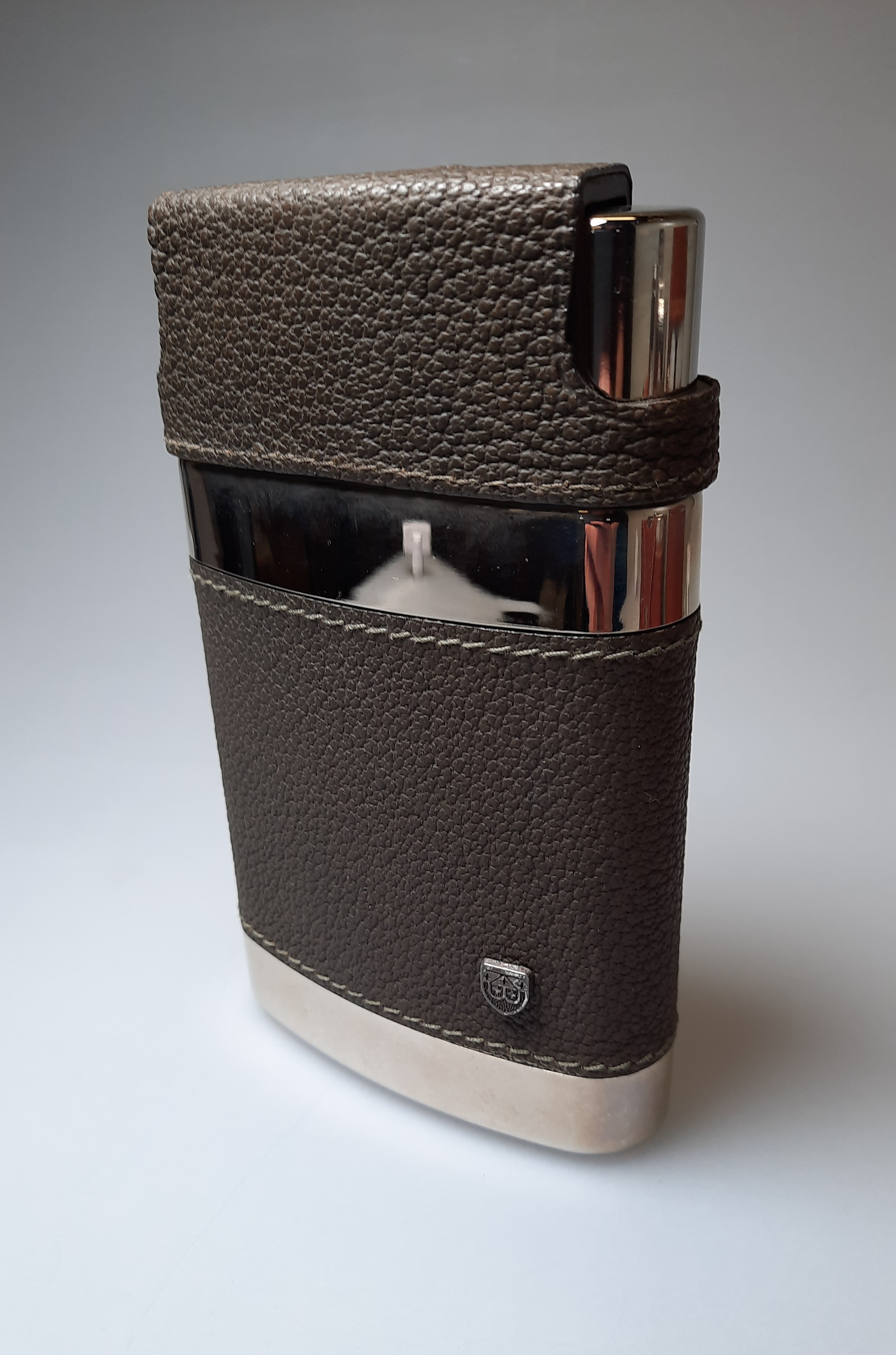 Flachmann / Taschenflasche aus Hart-PVC, fest beledert, 3 integrierte Becher.