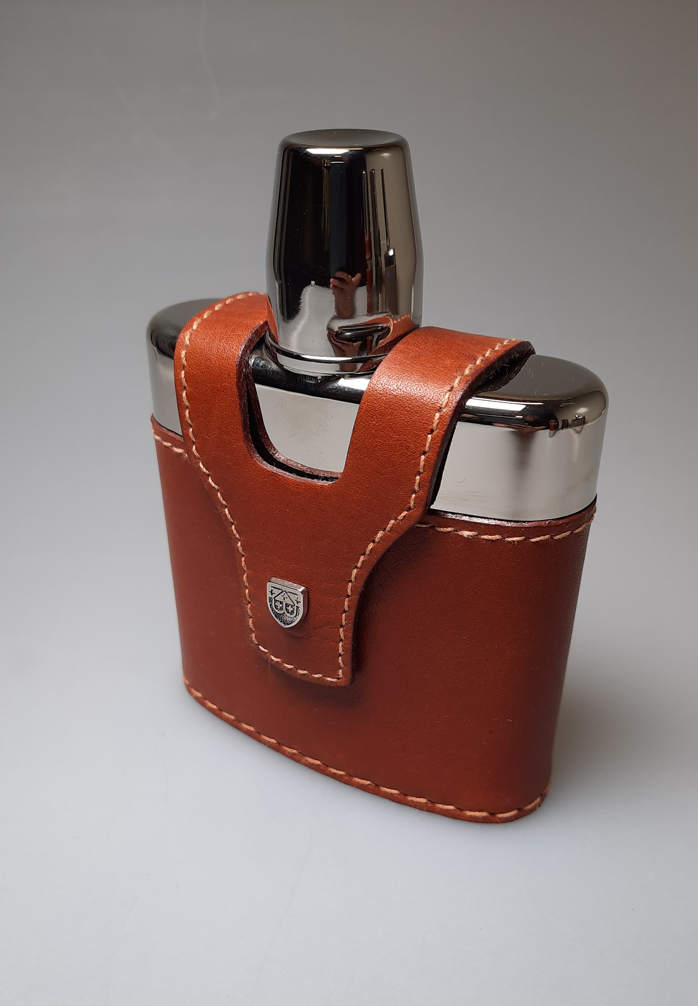 Flachmann / Taschenflasche aus Hart-PVC, in Lederetui, herausnehmbar.