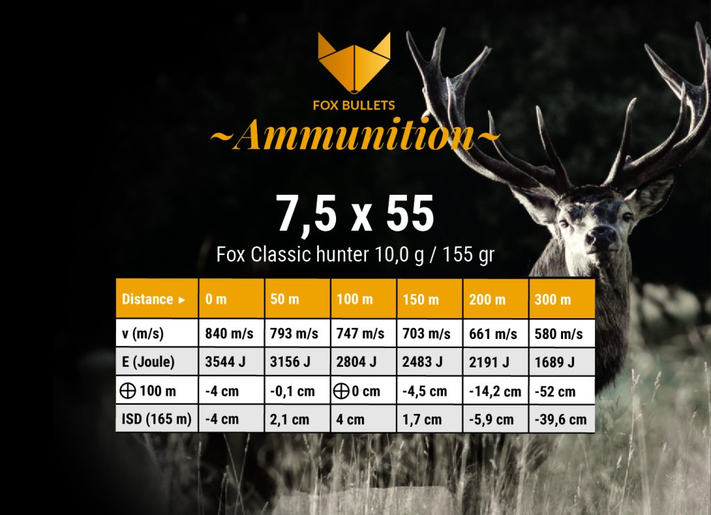 Bei den Fox Classic Hunter handelt es sich um bleifreie Geschosse, die für alle Jagdsituationen entwickelt wurden, die ein europäischer Jäger erleben kann, vom Nahschuss auf ein Wildschwein bei der Drückjagd bis hin zum extrem weiten Schuss auf ein Wildschwein im Hochgebirge. Die Geschosse sind bleifrei und bestehen aus einer Kupfer-Zink-Legierung. Das gewählte Material sorgt auch bei geringeren Aufprallgeschwindigkeiten (500 m/s) für eine ausreichende Verformung.