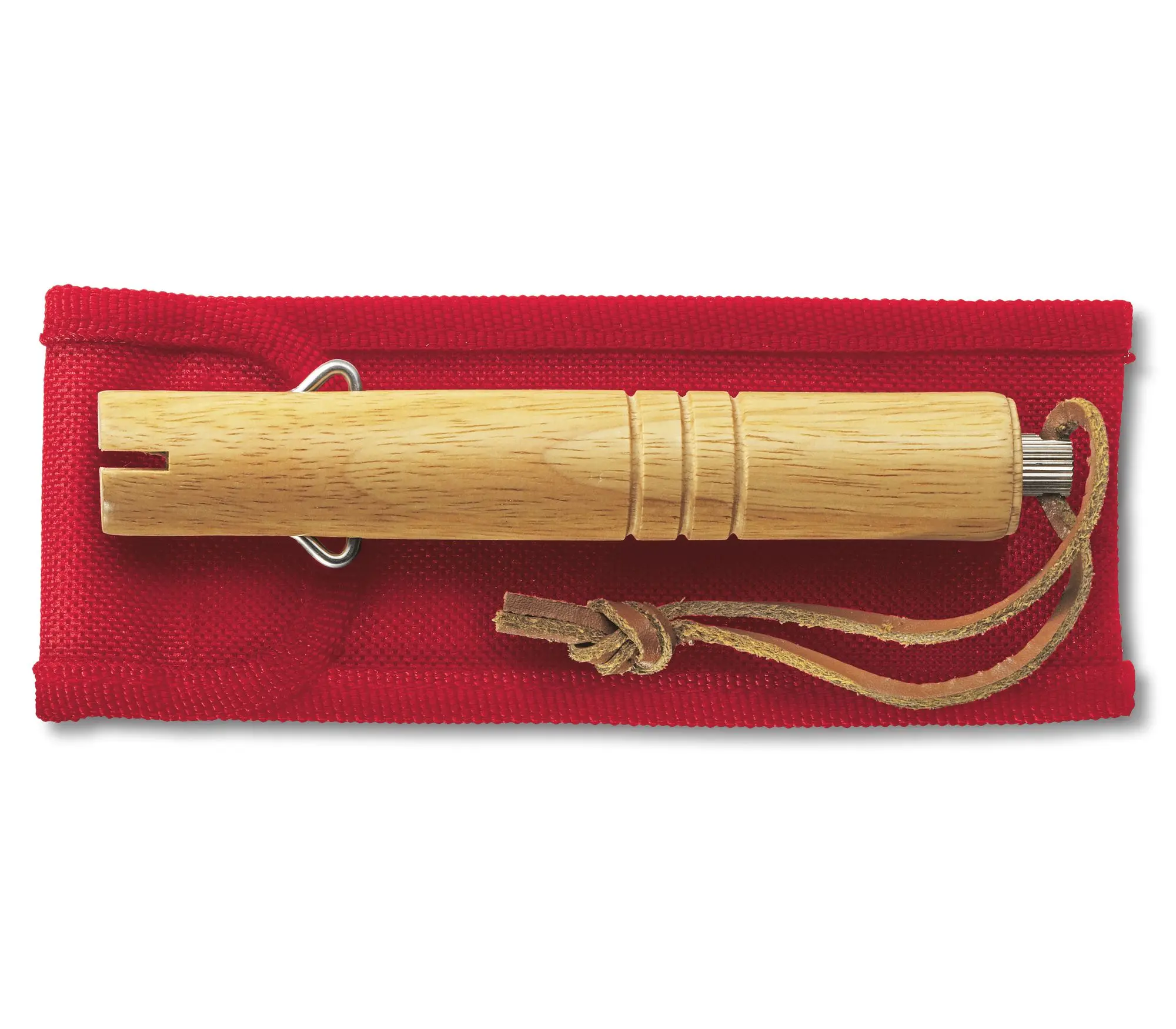 Material: Rostfreie Gabel, Buchenholz Griff, Lederbändel, rotes Nylon Etui mit Klettverschluss und Gurtschlaufe.